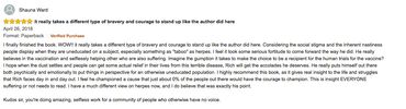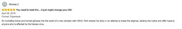 A brave personal account of the reality of life with HSV. Rich faces the stigma, naysayers, and supporters alike by putting it all out there, in your face, with purpose and pride. This relatable account is shared with humor, facts and experience in hopes to reach you, whether you have HSV or know someone that does, offering hope to end discomfort and an antiquated stigma. A must read! Thank you for being brave and standing up for the millions suffering in shame and silence.